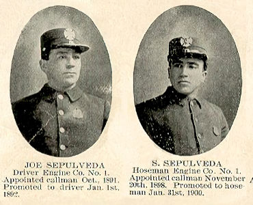 Solomon Dolores Francisca "Solly" Sepúlveda (my great-grandfather) and José (Joseph) Amado Malarín "Joe" Sepúlveda were brothers. They were the eldest sons of José Dolores de Jesús Sepúlveda and María Antonia Lugo. Both brothers were members of the Los Angeles Fire Department. Joe was appointed callman on October 30, 1891. Joe spent his career as a driver; he loved the horses. He retired April 2, 1929/30. Solly followed in his older brother's footsteps and was appointed callman November 20, 1898. Solly became a Captain June 16, 1906 and retired as Captain on December 19, 1920.